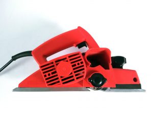 A woodworking electric planer. Its primary function is to smooth the surface of wood, but it can also be used to smooth wood’s rough end grain. It’s also used for tapering wood. If a door is too wide, for instance, make passes with a power planer over the side of the door, adjusting the depth gauge to give a cut of the desired depth.